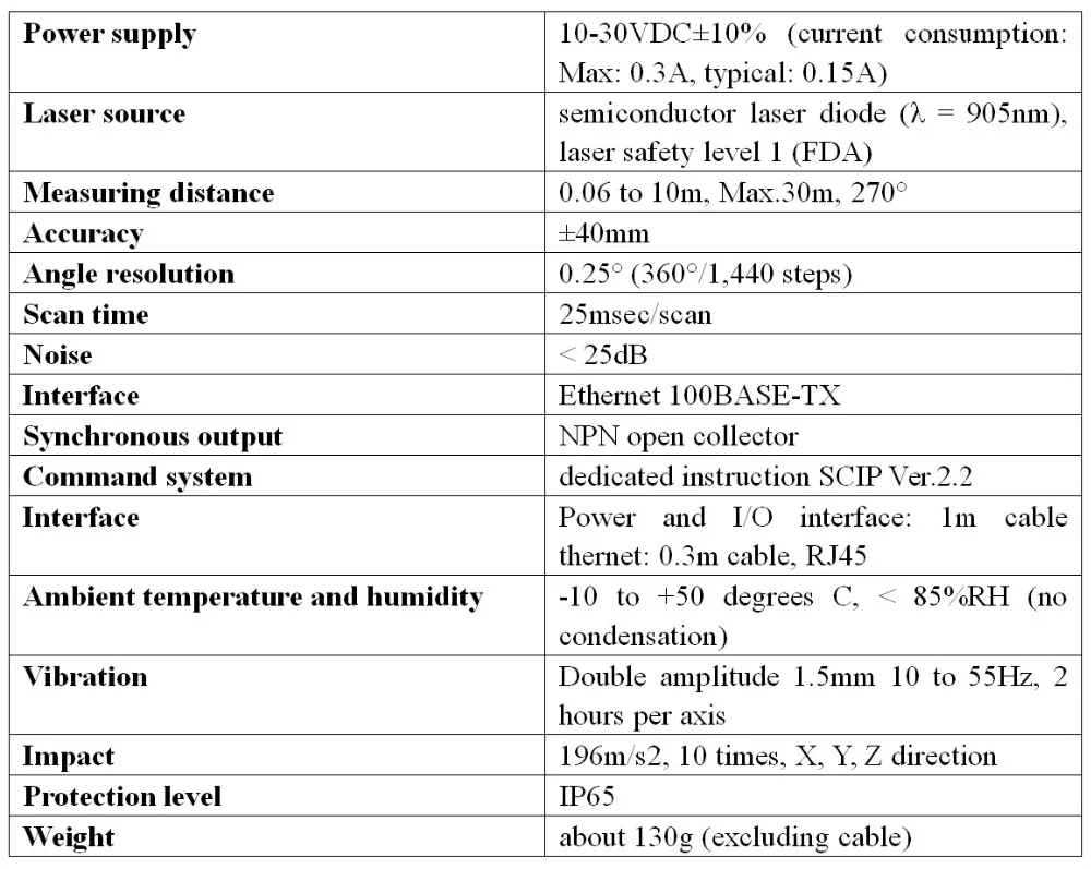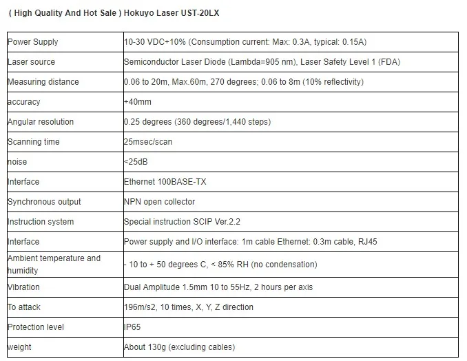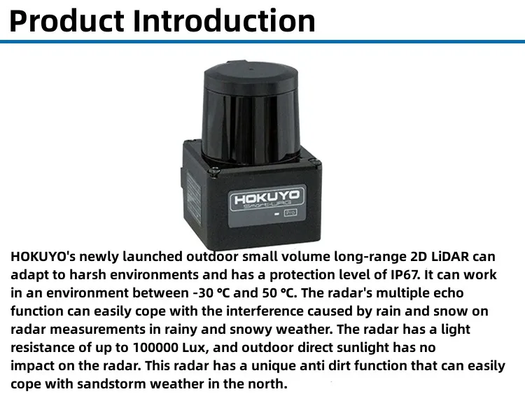 UST-10LX 2D Lidar products have a 10m, 270° measurement range, DC12V/24V input, 25ms scan time, IP65 protection, non-contact measurement. It can be used for high-speed motion robot obstacle avoidance and position recognition; high-precision, high-resolution, wide-field design provides a good environment recognition capability for autonomous navigation robots; compact design saves installation space, low weight and low power consumption.